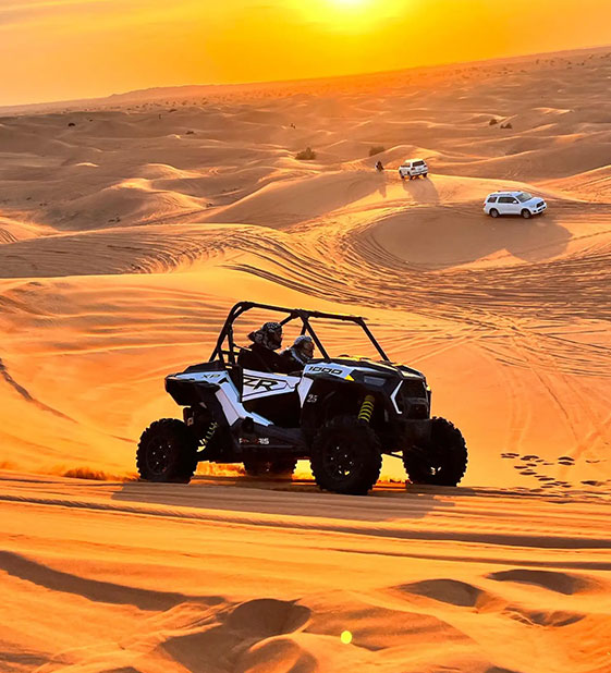 A desert safari with a dune buggy ride offers an exhilarating adventure in the heart of the desert, on red sand dunes. This thrilling activity begins with a 4x4 ride to the desert, where you’ll be introduced to your dune buggy — a powerful off-road vehicle designed for rugged terrain. After a safety briefing, rev up the engine and embark on an exciting ride across the dunes. The wind in your hair, the roar of the engine, and the vast, untouched desert make this an unforgettable experience. Feel the control and freedom as you race over the dunes — both thrilling and awe-inspiring!